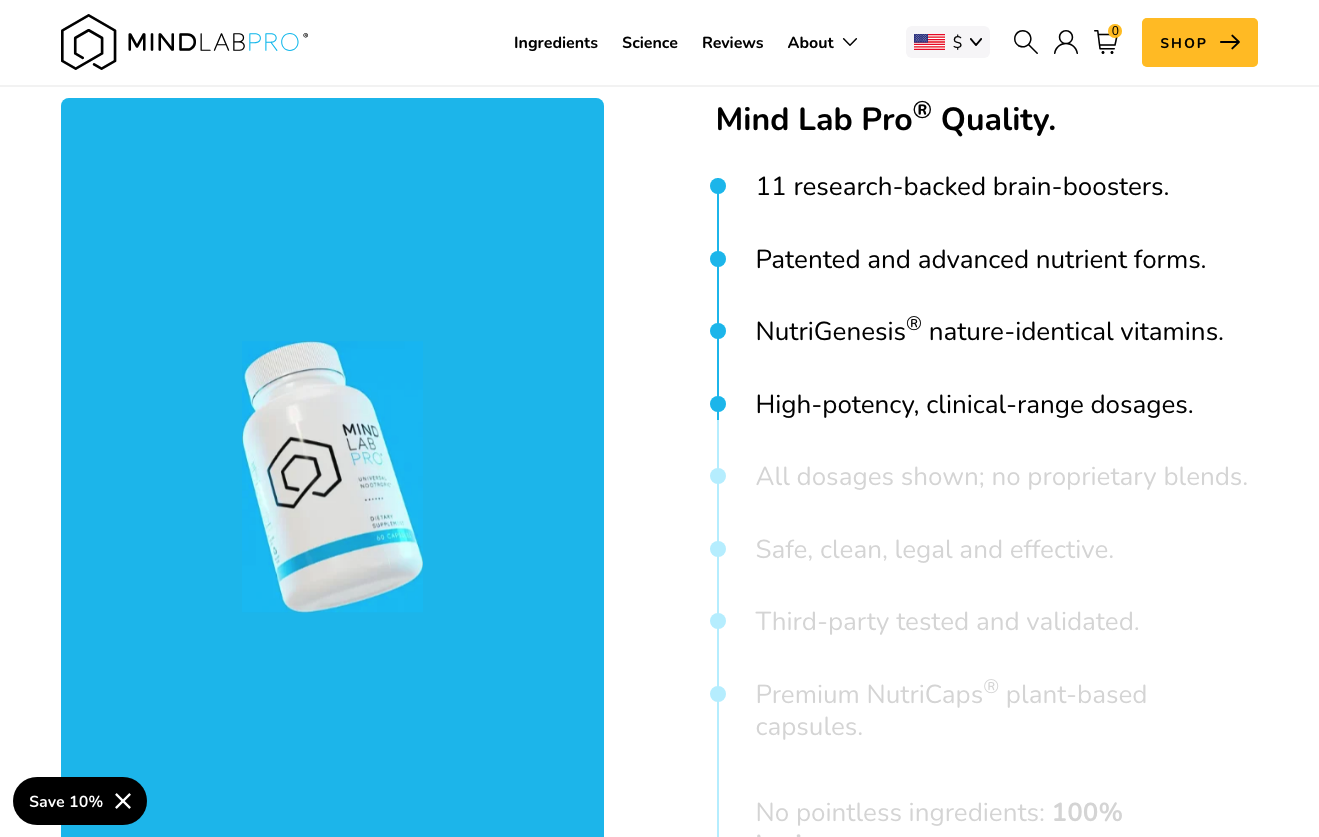 For example, if you check out Mind Lab Pro, you’ll see that this brand makes indirect comparisons. By emphasizing that it lists all ingredients on product labels, uses clinically researched dosages, and uses safe, clean, and legal ingredients, this brand subtly communicates that its competitors don’t do the same, highlighting the superiority of its own nootropic supplement.