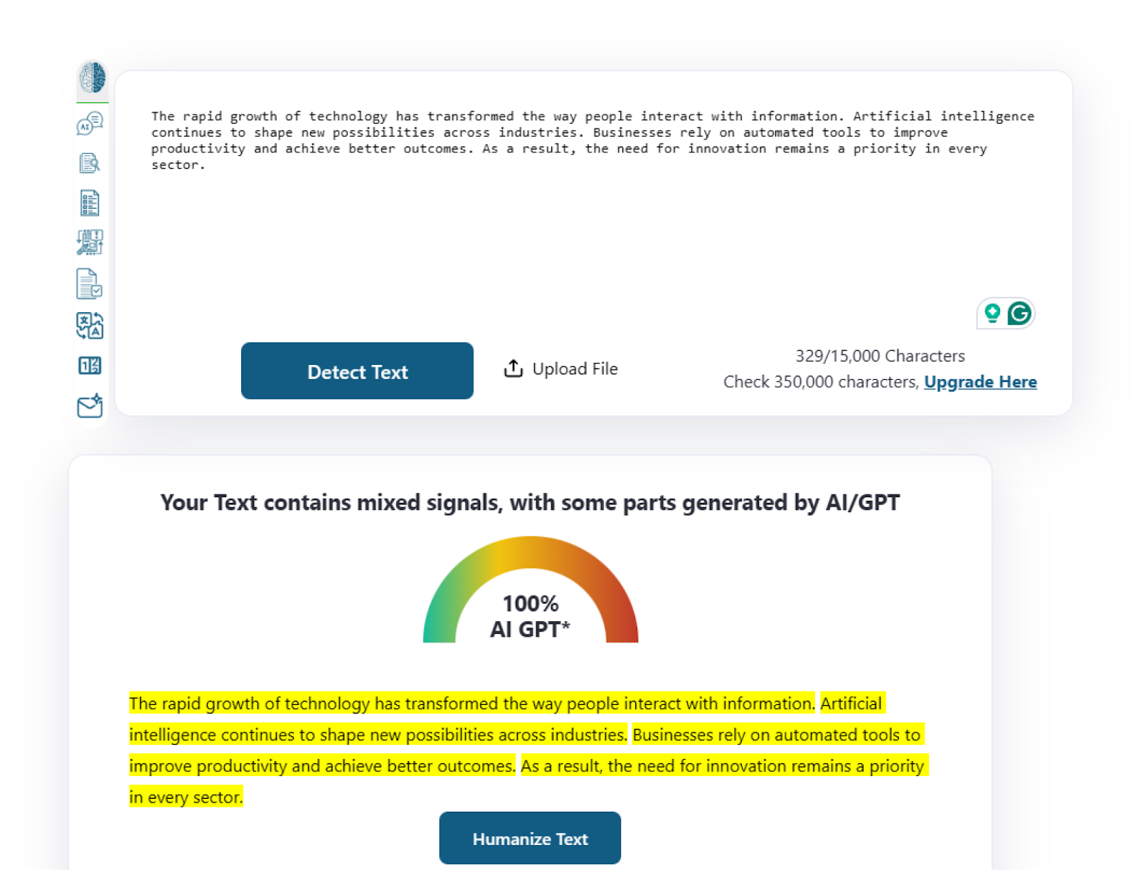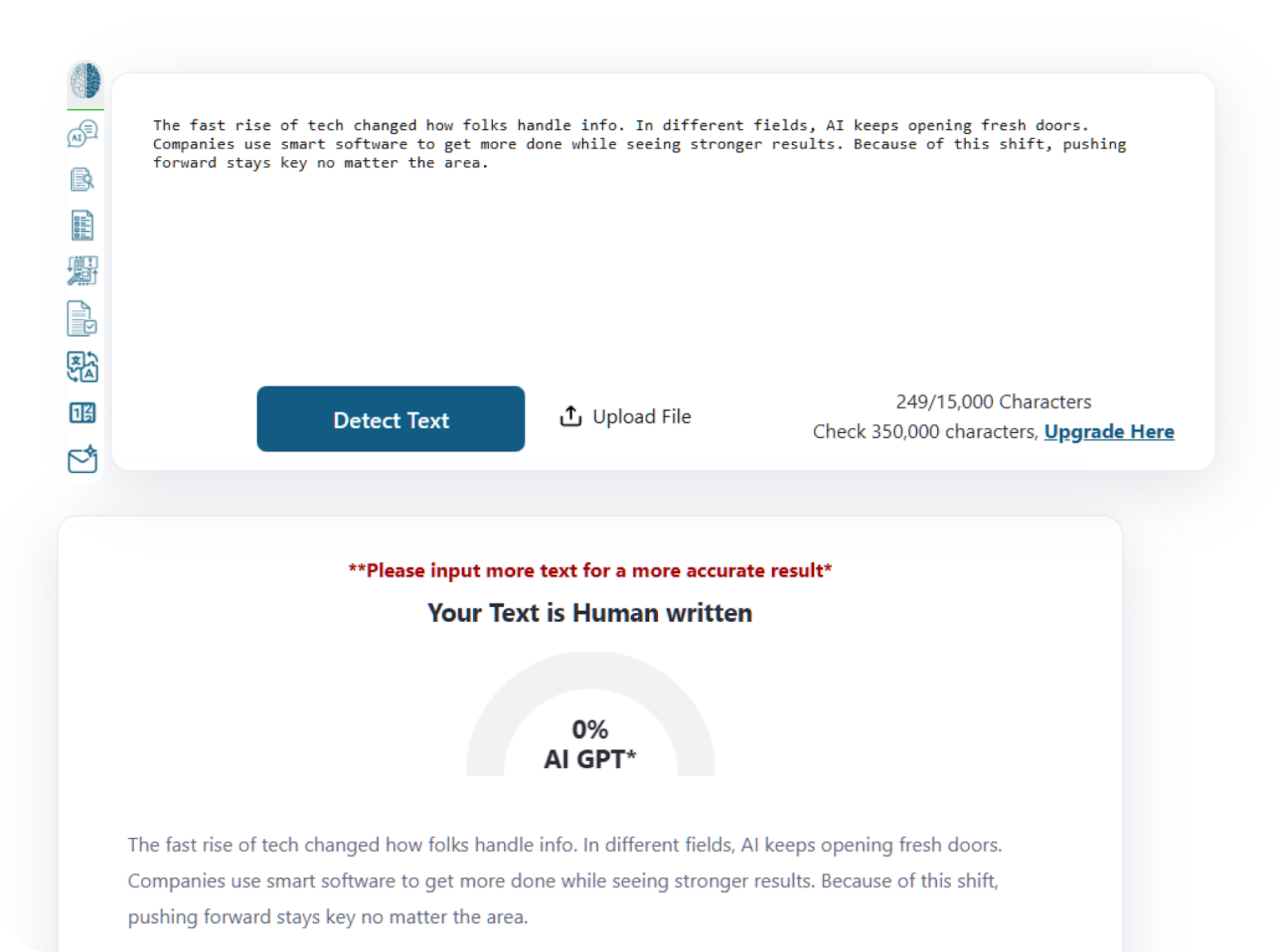- Recheck detection results. Paste the new version back into your detector. As you can see in our tests, the score drops to zero percent. You can repeat this process for any sections that still look machine-generated.