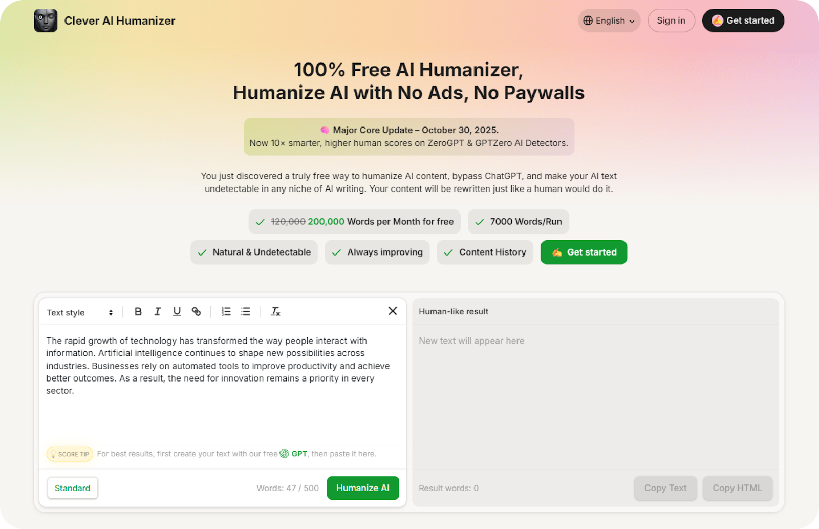 As the developer states in the update from October 30, 2025, the system now works with far higher accuracy and reaches stronger human scores on ZeroGPT and GPTZero. This improvement raises the overall reliability of the platform and helps the output pass real-world tests with greater confidence.
